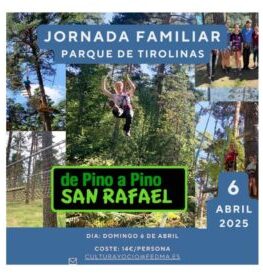 ¿Listo para vivir nuevas aventuras en la altura de los árboles? Un nuevo parque de tirolinas en el bosque de la Sierra de Guadarrama con cinco circuitos de dificultad creciente desde los 2 hasta los 12 metros de altura, para todos los niveles. De Pino a Pino San Rafael es una actividad lúdica para todo tipo de públicos en un precioso bosque reserva de la biosfera a tan solo 40´de Madrid. Compartiréis en familia un día inolvidable realizando juegos como los balancines del chimpancé, la liana indiana, el trapecio volante, el paso del himalaya….y ¡por supuesto volar con más de 12 tirolinas entre pinos silvestres!
