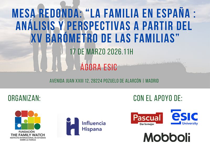 La Fundación The Family Watch e Influencia Hispana, con el apoyo de ESIC University, organiza la mesa redonda «La familia en España: análisis y perspectivas a partir del XV barómetro de las Familias» con el objetivo de difundir los resultados del XV Barómetro de las Familias, así como promover un debate constructivo y contribuir a la sensibilización social e institucional sobre la importancia de apoyar a las Familias ante los retos presentes y futuros.