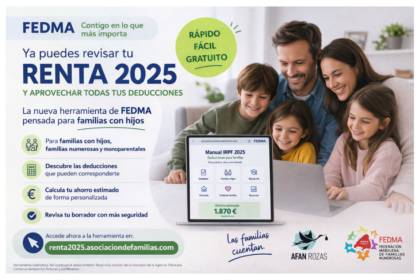 Desde FEDMA sabemos que muchas familias numerosas no siempre conocen todas las deducciones a las que pueden tener derecho o no tienen claro cómo revisarlas en el borrador. Por eso, esta herramienta nace con un objetivo muy concreto: ayudaros a identificar posibles beneficios fiscales y facilitaros la campaña de la Renta con información clara, práctica y adaptada a la realidad de las familias.